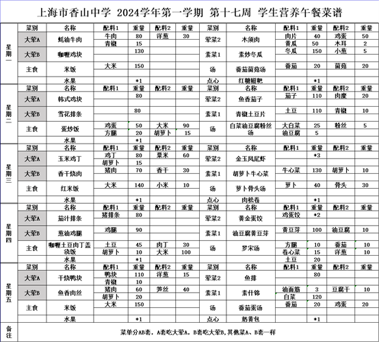 上海市香山中学 2024学年第一学期 第十七周 学生营养午餐菜谱